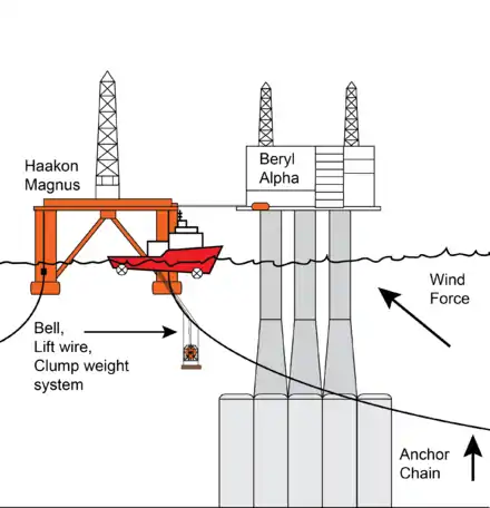 Prior to the accident, the wind-speed indicator was fluctuating between 15–20 knots (28–37 km/h). Standing alongside the Beryl platform, near where the Canopus would be commencing work, was the Haakon Magnus, a Norwegian semi-submersible platform, with her massive anchor chains extended. Kelly determined the weather was suitable for diving and, at 0240, he launched the bell with Tony Prangley and Michael Ward inside.[14]
