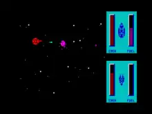 When two rival starships meet on the battlefield, an arcade-style combat sequence begins.[4] Each battle takes place on a single screen with an overhead view, zooming in as the two ships approach each other.[1] The battlefield includes a planet as a gravity well, which ships can either crash into, or glide nearby to gain momentum.[1] There are 14 different ships to choose from, with unique abilities for each.[4] Ships typically have a unique firing attack, as well as some kind of secondary ability.[1] For example, the Yehat Terminator has a forcefield, while the VUX Intruder can launch limpets that slow rival ships down.[3] Using these weapons and abilities will consume the ship's battery, which recharges automatically (with few exceptions).[1] Ships also have a limited amount of crew, representing the total damage a ship can take before being destroyed.[1] This ties into the strategic meta-game between combat, where the crew can be replenished at colonies.[1]