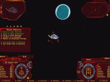 The ultimate objectives of most missions are to warp to a target system, destroy or capture enemy starships or installations, and return to a home base. Elements of stealth, espionage and survival or guile against overwhelming forces are sometimes featured. As one plays through the game, progressively larger and more powerful starships are awarded to the player, with enemy forces to match. Many missions offer the player escort ships of equal or lesser class to their own, which must be managed through the HUD interface.