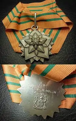 The Star of South Africa, post-nominal letters SSA, is a military decoration for merit which was instituted by the Union of South Africa from 1952 to 1975. It was awarded to general and flag officers of the South African Defence Force for exceptionally meritorious service. The Star of South Africa was discontinued on 1 July 1975, when a new set of orders, decorations and medals was instituted.[1][2]