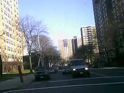 The development was designed by Herman Jessor, organized in the towers in the park layout. The buildings utilize a simple "foursquare" design.[10][11]:56[12] The residential portion of the property has eight "sections" each including several buildings, its own field, recreational area (jungle gym, park, handball court, basketball court) and a five-story parking garage for residents in that section.[13] These sections are Ardsley, Bethel, Croton, Delmar, Elmira, Freeport, Geneva, and Hornell, which are each named after municipalities in New York State.[14] The residential part of Starrett City includes eight parking garages, a community center, and two public schools.[9]:2–3[15] The area contains a shopping center as well.[15] Starrett City is said to be the largest federally assisted rental property in the United States.[10][16]