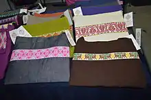 The making of textiles in particular is both economic and cultural. Most is done in indigenous communities such as the Mazatecos, Nahuas, Mazhuas and Otomis, and have designs the identify wearers as part of those communities.[2] The Otomis and Mazahuas are particularly known for their embroidery.[8] Towns noted for their textiles include Jiquipilco, Tejupilco, Temascaltepec, Temoaya, Valle de Bravo, Zacazonapan, Toluca and Tenancingo. In general items such as napkins, tablecloths, sheets, curtains, blouses, aprons, sets for kitchen and bathroom, can be found along with rugs. Two traditional garments that are still seen include the poncho like quechquemitl , and a traditional shawl-type garment called a rebozo. In the State of Mexico, most woven pieces are wool or cotton/wool. Textiles include pieces woven from a cotton/wool mix, often decorated with multicolored flower and animal designs arranged geometrically on the cloth. The decorations used to have religious symbolism, but this as mostly been lost.[2][9][10]