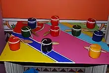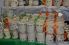 Metepec is the state's main pottery center, with a production that stands out for its variety and artistry, which has evolved slowly since the colonial period.[1][2] Although part of the Toluca metropolitan area, the center of this municipality maintains its small town atmosphere, with handcrafts filling stores and street stalls on the streets near the San Juan Bautista parish church.[4] The municipality is home to over 300 artisans and 270 families dedicated in one way or another to this industry, which is its main economic activity.[5] Most of the pottery produced is common glazed wares for everyday use such as large pots, plates and casseroles, often with a blue, green or yellow glaze.[1][2] However, the municipality is better known for its decorative pieces, generally unglazed and painted tempuras in bright and contrasting colors.[1][5] These include items such as nativity scene pieces, figures of horses, sun plaques (hung on the outside of houses) and mermaids, but the most notable decorative piece is called the “tree of life.”[2][5] These look like candelabras which lack places to put candles. Traditionally these were made as allegories for the story of Adam and Eve in the Garden of Eden, and these continue to be made.[3][6] More recently, trees with other themes have appeared including Day of the Dead, pottery making and more. These are low fire pieces, and most are small, no more than thirty cm in height, but monumental versions are made as well such as the one that is in the collection of the Vatican museums.[5][6] Most are also painted in bright colors such as magenta, red, blue, yellow, green, orange and purple but some are left unpainted. In 2009, the Metepec style has been legally protected from imitations by denominación de origen.[6]