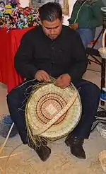 Stiff vegetable fibers such as reeds are used to make hats, mats and more in addition to baskets for carrying and storage. Most artisans of this type are indigenous and is most commonly done in Jiquipilco, Temascalcingo, Tenancingo and Toluca (in the San Andres Cuexcontitlan and San Cristobal Huichochitlan neighborhoods), where they produce tortilla holders, bags, placemats and more. The use of dyed fibers woven into patterns is a common decorative technique. Most of the designs are passed down from generation to generation. There is also basketry done in Amanalco, Donato Guerra and El Oro, distinguished with ornaments of high fire ceramic, brass and glass.[10][24]