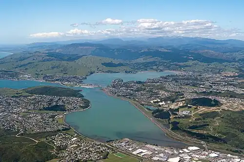 In the post war era, a shortage of housing in Wellington led to a need for increased housing development. The satellite community of Porirua, 20 km from New Zealand’s capital, Wellington was a collection of planned suburban development to meet this demand.[1] It has been described as 'a planning guinea pig’ where it would follow similar ideas and direction to the British New towns movement.[2]: 59 Between the 1940s and 1970s it was planned and developed for 70,000 people.[3] In the late 1950s and 1960s it would transform from a village to city.[4] The Department of housing and construction and in particular when it was under the First Labour Government had a major role in its development. A large number of families, many of them migrants, flooded into Porirua’ into mostly State houses.[5] By 1977, 78% of Porirua was State housing and it was the country's largest single concentration of public dwellings,[1] (this dwindled to 41% in 2012).[6] The population has increased from 5000 people in 1950 to 21000 in 1966[1] and 52,700 in 2012.[6] The four main state-planned and housing estate suburbs of Porirua are Titahi Bay, Porirua East, Cannons Creek, and Waitangirua.