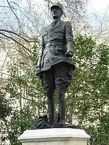 The statue was campaigned for by Mary Soames, the daughter of De Gaulle's contemporary Winston Churchill.[2] It was unveiled by Queen Elizabeth The Queen Mother on 23 June 1993 in the presence of Jacques Chirac, at that time Mayor of Paris, and the President of the National Assembly Philippe Séguin,[1] as well as De Gaulle's chauffeur-translator Olivia Jordan.[3] The architect was Bernard Wiehahn and the sculptor Angela Conner.[4] De Gaulle is portrayed in the uniform of a brigadier-general.[5] The statue is one of 39 in London maintained by English Heritage, the majority of which are in Westminster.[6]