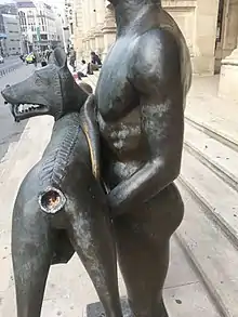 The sculpture depicts Trajan, the Roman emperor who conquered Dacia, the province located in today's Romania and considered one of the "parents" of the Romanian nation. In his arms, in fact appearing to levitate above his arms, is the Capitoline Wolf, the she-wolf in the founding myth of Rome. The head of the wolf is joined to the tail of a Dacian Draco.[1]