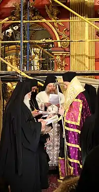 The Exarch (Greek: Ο Έξαρχος, ο «εκ της αρχής», romanized: O Έxarchos, o «ek tes arches») is a representative of the Patriarch and his personal envoy, who carries out ordinary pastoral activities in Stauropean monasteries or churches.