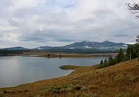 Steamboat Lake State Park is a Colorado state park located in Routt County 27 miles (43 km) north of Steamboat Springs, Colorado, and near the community of Hahns Peak Village. The 2,820-acre (1,140 ha) park land west of Hahns Peak was acquired in 1966.[2] It and the 1,101 acres (446 ha) reservoir was opened to the public in 1972.[3][2] As of 2021 park facilities include a visitors center, marina,[2] boat ramps, campsites, cabins, picnic sites and 5.5 miles (8.9 km) of hiking trails. Plant communities include sagebrush shrubland, quaking aspen and lodgepole pine forests, willow carr and marsh. Commonly seen mammalian wildlife species include mule deer and red fox. The reservoir attracts many species of shorebirds and waterfowl, including sandhill cranes that nest in the wetland areas.