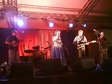 With two female singers, the original line-up was unusual for the time, and indeed, never performed live, as the Woodses departed the band shortly after the release of the group's debut album, Hark! The Village Wait (1970).[3] While recording the album, the five members were all living in the same house, an arrangement that produced considerable tensions particularly between Hart and Prior on the one hand and the Woodses on the other. Terry Woods maintains that the members had agreed that if more than one person departed, the remaining members would select a new name, and he was upset that this did not happen when he and Gay Woods left the band. Gay and Terry were replaced by veteran folk musician Martin Carthy and fiddler Peter Knight in a longer-term line-up that toured small concert venues, recorded a number of BBC Radio Sessions,[3][4] and recorded two albums – Please to See the King (1971) and Ten Man Mop, or Mr. Reservoir Butler Rides Again (1971).[3] While the first album was traditionally performed – guitars, bass and with two guest drummers – Please to See the King was revolutionary in its hard electric sound and lack of drums.