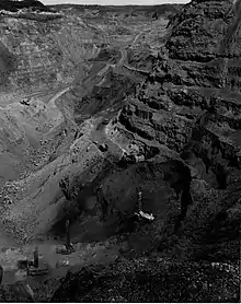 During World War II, a program was implemented to drain the lake.[4] This diversion of the river allowed open-pit mining of hematite iron ore under the middle arm of the lake by Steep Rock Iron Mines Limited and the East arm was mined by Inland Steel Company through its subsidiary Caland Ore Company Limited. By 1949, the site was producing a million tons of ore per year and had an estimated 500 million tons of ore deposits.[5][6][7][8]