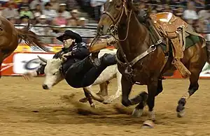 Steer wrestling, also known as bulldogging, is a rodeo event in which a horse-mounted rider chases a steer, drops from the horse to the steer, then wrestles the steer to the ground by grabbing its horns and pulling it off-balance so that it falls to the ground. The event carries a high risk of injury to the cowboy. Some concerns from the animal-rights community express that the competition may include practices that constitute cruelty to animals, but the injury rate to animals is less than 0.05%.[1] A later PRCA survey of 60,971 animal performances at 198 rodeo performances and 73 sections of "slack" indicated 27 animals were injured, again around 0.05%.[2]