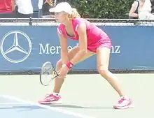 Vögele began the US Open Series at the Stanford Classic where she defeated wildcard Ajla Tomljanović in the first round 6–4, 6–0.[41] In the second round, she lost to third seed and eventual champion, Dominika Cibulková.[42] Playing at the Washington Open, Vögele lost in the first round to sixth seed Mona Barthel.[43] Seeded fifth for qualifying at Cincinnati, Vögele lost in the first round of qualifying to Sofia Arvidsson. Seeded fifth for qualifying at New Haven, she qualified by defeating American wildcard Katerina Stewart, Alexandra Cadanţu, and Yaroslava Shvedova. In the first round, she lost to fellow qualifier Alison Riske. At the US Open, Vögele lost in the first round to world No. 105, Anna Karolína Schmiedlová.