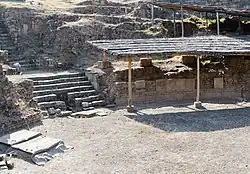 The circular plaza is located in front of the building called "B", Old Temple or Ancient Temple.[6] It is semi-sunken with a depth of 2.5 metres (8 ft 2 in), has two entrances (to the east and west) and has a diameter of 21 metres (69 ft).[7]