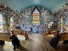 The walls of the chapel are covered with notes of remembrance and pictures of visitors' deceased pets.[21] Outside the chapel is a sign reading "Welcome All Creeds All Breeds No Dogmas Allowed."[1] Friends of Dog Mountain, the non-profit that manages the site, describes the chapel as Huneck's "greatest and most personal artistic contribution" as well as "a living piece of communal art and history, ever evolving with each new note and photo pinned to the memorial walls."[20]