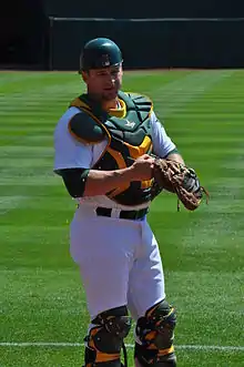 Through the first half of the season, Vogt had a slash line was .277/.320/.442 in 72 games, with seven home runs,[224] and 27 RBIs.[30] Though his offensive numbers were lower than his first-half numbers in the 2015 season,[225][226] catchers' numbers in general were down across the league,[225] and Vogt's batting average ranked in the top five among catchers. He also led all catchers with 18 doubles.[30] Vogt was selected for the 2016 Major League Baseball All-Star Game, marking his second consecutive appearance.[227][228] He was Oakland's sole All-Star representative for 2016,[229][230] and he was the first Athletics non-pitcher named to consecutive All-Star teams since Jason Giambi in 2000 and 2001.[225][226] Vogt did not get to play in the All-Star game itself,[231][232] as Salvador Pérez and Matt Wieters were the only American League catchers who played.[224]