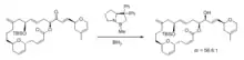 Stereocontrolled 1,2-additions to carbonyl groups (especially ketones) are an important class of reactions because they provide access to substituted alcohols, generating a new stereocenter in the process. Especially widespread are various reagents for stereocontrolled 1,2-hydride additions (or reductions) of ketones. A well-known method to synthesize enantiopure alcohols by ketone reduction is the Midland Alpine borane reduction, named after its inventor Professor M. Mark Midland.[1] The strategy uses a chiral organoborane, derived from the hydroboration of alpha-pinene by 9-BBN, to differentiate enantiotopic faces of a ketone. Following workup with basic hydrogen peroxide, the product alcohols can be obtained, often with high degrees of enantioselectivity. The reaction works best if one of the ketone groups has low steric hindrance, such as an alkyne or nitrile. Another method, first developed in the 1980s, is called the Corey–Bakshi–Shibata reduction (CBS), and it features the use of an oxazaborolidine catalyst along with borane as a reducing agent for accomplishing enantioselective ketone reductions. The CBS reduction has been used extensively by chemists en route to synthesizing a wide variety of natural products, including alkaloids, terpenoids, pheromones, and biotins.[2] Fig. 1 shows an example of a diastereoselective CBS reduction being used to prepare a complex macrocyclic alcohol en route to the synthesis of 11-desmethyllaulimalide[3] (an analog of the antitumor agent laulimalide). The authors noted that CBS reduction was much more effective than using either lithium tert-butoxyaluminum hydride or L-Selectride. The CBS catalyst, usually prepared from diphenylprolinol,[4] often can be used in low catalyst loadings, even as low as 2%.