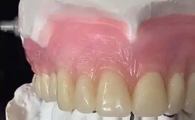 The gingiva often possess a textured surface that is referred to as being stippled (engraved points).[1] Stippling only presents on the attached gingiva bound to underlying alveolar bone, not the freely moveable alveolar mucosa or free gingiva. Stippling used to be thought to indicate health, but it has since been shown that smooth gingiva is not an indication of disease, unless it is smooth due to a loss of previously existing stippling.