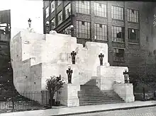 A row of cottages previously occupying the site were purchased and demolished. A set of limestone steps was then built to connect Mersey Square with the higher-level Lawrence Street, which are now known as The Plaza Steps. 10,000 tonnes of sandstone was excavated to a depth of 42 feet to create The Plaza and the adjacent steps, leaving the building partially underground and secured by 111 rock bolts.[8] The Plaza was welcomed by the local cinemagoers but opposed by the local business community, unhappy about the use of labourers from elsewhere while the town was still suffering from the Great Depression. Technically the cinema had all the latest equipment the projectors that could project silent and sound stock, and a Compton organ to be played during the silent news reels. It opened as a cine-variety venue.[5]