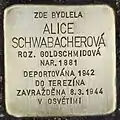 Alice Schwabacherová née Goldschmidová was born in 1881. She was the second daughter of Max Michael Goldschmid. After her marriage she moved to Prague. In April 1942 she and her husband were deported to Theresienstadt concentration camp where her husband was killed. In September 1943 she was deported to Auschwitz concentration camp. During the night of 7 to 8 March 1944 she was murdered in a gas chamber.