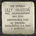 Lilly Haasová née Goldschmidová was born in 1884. Her husband, Rudolf Haas, came from Mladá Boleslav but lived in Prague. After she became a widow, Lilly returned to Nachod, where she lived first with her brother Hanuš, in her parents' house, and later-on, when Jews were not allowed any longer to stay in the square, she moved to the house of the Schura family in Tyršova street with her sister Jenny. Both sisters were deported to Theresienstadt concentration camp in December 1942. The following year, in September 1943, Lilly was included in a transport to Auschwitz concentration camp, where she was placed at the so-called 'Family camp'. She was murdered in a gas chamber on 8 March 1944.