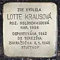 Lotte Krausová née Goldschmidová, also Lola, was born in 1898. She was the youngest daughter of Max Michael Goldschmid, twenty years younger than her oldest sister Jenny. He stayed in a house on the square until 1928 and then married Karl Kraus, a physician The couple had a son, Míša, born in 1930. The family was deported on 14 November 1942 from Hradec Králové to Theresienstadt concentration camp where they spent one year. In December 1943, they were transported to Auschwitz concentration camp and placed at the so-called Family camp. Her husband was killed in a gas chamber, Lotte Krausová was deported to Stutthof concentration camp near Gdansk. Debilitated by forced labour and disease she died on 8 January 1945.