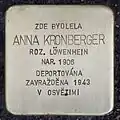HERE LIVED ANNA KRONBERGER NÉE LÖWENHEIN BORN 1906 DEPORTED MURDERED 1943 IN AUSCHWITZ |