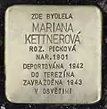 HERE LIVED MARIANA KETTNER NÉE PICKOVÁ BORN 1901 DEPORTED 1942 TO THERESIENSTADT MURDERED 1943 IN AUSCHWITZ |