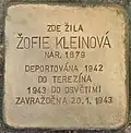 Beila Berta Kafková was either born on 22 May 1883 or on 22 May 1884.[34] Her parents were Bernard Issakhar Kafka and Elenora Kafková. She was married to Max Beniamin Meir Kafka. The couple had two sons, Osvald (born 1908) and Otakar (born 1919), see above. She was a housewife. On 26 November 1942, she and her sons were deported from Klatovy to Theresienstadt concentration camp by transport Cd. Her transport number was 127 of 651. According to two serious sources she died in Theresienstadt, most probably on 13 December 1942. Therefore, the inscription on the Stolperstein, indicating that she was deported to Auschwitz in 1943 and was murdered there, might be wrong.[35][36]