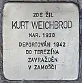 Kurt Weichbrod was born on 12 August 1930. His grand mother was Valenina Straussová, his parents were Markus Weichbrod and Adela née Straussová. On 24 April 1942 he and his parents were deported with transport Am from Prague to Theresienstadt concentration camp. His transport number was 123. Four days later, on 28 April 1942, he and his parents were deported with transport Ar to Zamošč. His transport number was 744. The eleven-year-old boy and his parents did not survive the Shoah.[13] |