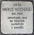 Markus Mechel Weichbrod was born on 24 December 1896. He married Adela née Straussová. The couple had one son, Kurt, born in 1930. On 24 April 1942 he, his wife and his son were deported with transport Am from Prague to Theresienstadt concentration camp. His transport number was 121. Four days later, on 28 April 1942, the family was deported with transport Ar to Zamošč. His transport number was 742. Markus Weichbrod, his wife and his son were murdered in the course of the Shoah.[14] |