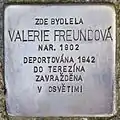 Valerie Freundová née Stern was born on 13 October 1902. She was the daughter of Hugo Stern, also Jizchak or Jehuda, and Marie, also Mirjam. She married Walter Freund. The couple had at least one daughter named Zuzinka, born in 1933. Both mother and daughter were deported with transport Ck from Prague to Theresienstadt concentration camp on 22 December 1942. Her transport number was 931 of 1005. On 4 October 1944 both were deported with transport En to Auschwitz concentration camp. Her transport number was 259 of 1500. Both mother and daughter were murdered by the Nazi regime in Auschwitz.[16][17]
