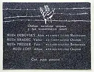 ![]() Josef Seidler and Matylda Seidlerová on a common monument in Boršice Josef Seidler was born on 10 August 1897. He married Matylda Seidlerová. The couple had at least one son, Valtr, born in 1926. On 23 January 1943, he, his wife and their son were deported from Uherské Hradiště to Theresienstadt concentration camp by transport Cn (his transport number was 941 of 1,003). From there, on 26 January 1943, the family were transferred to Auschwitz-Birkenau by transport of Cs, train Da 105 (his number on this transport was 794 of 1,000). There all three were murdered by the Nazi regime.[1] The names Josef Seidler, Matylda Seidlerová and Vladimír Seidler are inscribed on a monument in Boršice. |