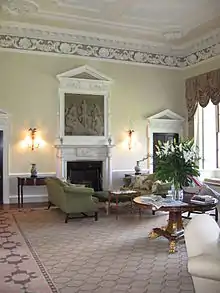 Reception Room at Ston Easton Park. The square panel over the fireplace is a trompe-l'œil painting.