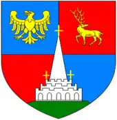 - ↑ Blazoned as Quarterly azure and gules, the perspective of an antique temple argent on the pinnacle and exterior battlements a cross or; in the first quarter an eagle displayed in the second quarter a stag trippant reguardant both of the last.[1]