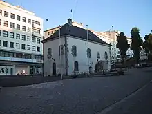 The pedestrianised section has mainly smaller buildings with 2-4 floors, built before the 20th century. Significant buildings include Strandgaten 59, the former building of Sundt & Co, today located at Torgallmenningenn, and Tetingsalen (Strandgaten 53), a former brewery, public house, concert hall, theatre, and today retail store. The western half of Strandgaten, west of Holbergsallmenningen, was rebuilt after World War II. The church of Nykirken is located here, one of the few buildings on the north-eastern shore of the Nordnes peninsula to have been preserved. The home of Edvard Grieg's family, where he grew up, was located in this part of Strandgaten, but it was destroyed when the steam trawler Voorbode exploded in 1944.[11] The ruins of Ludvig Holberg's childhood home were, too, located by Strandgaten, until they were removed in 1985.[1] Near the northern end of the street are the main offices of the Norwegian Directorate of Fisheries.[12]