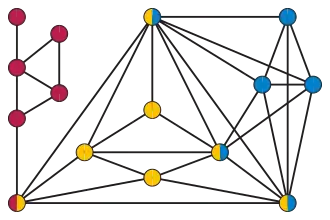 A strangulated graph, formed by using clique-sums to glue together a maximal planar graph (yellow) and two chordal graphs (red and blue). The red chordal graph can in turn be decomposed into clique-sums of four maximal planar graphs (two edges and two triangles).