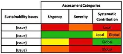 Once a sector is selected for an ESI analysis, a list of relevant sustainability issues is assembled. This baseline analysis will result in a list of issues outlining the subject sector's strengths and concerns that impact society and the environment. Next, prioritization colours are assigned to each sustainability issue: red for very high priority; orange for high priority; yellow for medium priority, and green for low priority according to its assessment in each of three categories: urgency, severity, and systematic contribution.
