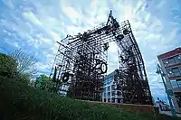 Stratiformis is a public artwork by Korean-born artist Jin Soo Kim located in Catalano Square, which is south of downtown in the Historic Third Ward of Milwaukee, Wisconsin, United States. The large sculpture combines disassembled knitting machines culled from a local apparel manufacturer in a grid of rusted rebar, all hand-wrapped with galvanized and copper wire.[1] It was installed in 2006.