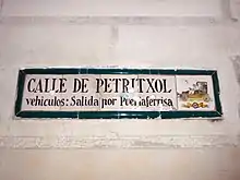 In a following phase, several streets were named with anthroponyms, names or surnames of characters or families, generally landowners. Some examples are Amargós, Avinyó, Bellafila, Bertrellans, Caçador, Copons, Esquirol, Estruc, Ferlandina, Fonollar, Lledó, Marquet, Mònec, Montcada, Montjuïc -from which Montjuïc del Carme and Montjuïc del Bisbe are derived-, Petritxol, Picalquers, Regomir, Requesens, Robador, Serra or Tarròs streets.[37]