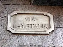 The Roman origin of the city is present in several streets, all derived from its full Latin name: Via Julia, from the Julio-Claudian dynasty that ruled the Empire at the time of the founding of the city; Via Augusta, after the Emperor Augustus; Via Favencia, a term derived from the Latin verb faveo ("to favor"), apparently because it was a colony exempt from taxes;[33] and Via Barcino, after the Latin name of the city.[34]