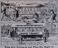 These streetcars used horses and sometimes mules. Mules were thought to give more hours per day of useful transit service than horses and were especially popular in the south in cities such as New Orleans, Louisiana.[1] In many cities, streetcars drawn by a single animal were known as "bobtail streetcars" whether mule-drawn or horse-drawn.[2][3] By the mid-1880s, there were 415 street railway companies in the U.S. operating over 6,000 miles (9,700 km) of track and carrying 188 million passengers per year using animal-drawn cars. In the nineteenth century Mexico had streetcars in around 1,000 towns and many were animal-powered. The 1907 Anuario Estadístico lists 35 animal-powered streetcar lines in Veracruz state, 80 in Guanajuato, and 300 lines in Yucatán.[4]