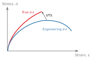 So in a tension test, true stress is larger than engineering stress and true strain is less than engineering strain. Thus, a point defining true stress–strain curve is displaced upwards and to the left to define the equivalent engineering stress–strain curve. The difference between the true and engineering stresses and strains will increase with plastic deformation. At low strains (such as elastic deformation), the differences between the two is negligible. As for the tensile strength point, it is the maximal point in engineering stress–strain curve but is not a special point in true stress–strain curve. Because engineering stress is proportional to the force applied along the sample, the criterion for necking formation can be set as
