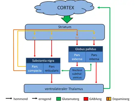 Overview of the main circuits of the basal ganglia. The striatum is shown in blue. Picture shows 2 coronal slices that have been superimposed to include the involved basal ganglia structures. + and signs at the point of the arrows indicate respectively whether the pathway is excitatory or inhibitory in effect. Green arrows refer to excitatory glutamatergic pathways, red arrows refer to inhibitory GABAergic pathways and turquoise arrows refer to dopaminergic pathways that are excitatory on the direct pathway and inhibitory on the indirect pathway.