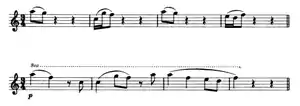 Dvořák quoted in the third movement, measures 21–24, a bird that he heard in Iowa. The song appears as a high, interrupting strain in the first violin part.[24] Dvořák was annoyed by this bird's insistent chattering, and transcribed its song[25] in his notebook. In 1950s English musicologist identified the bird as a scarlet tanager - a claim that has been repeated in books ever since. However, American ornithologist Ted Floyd showed in 2016 that the bird quoted by Dvořák likely was not a scarlet tanager; instead, the bird was probably a red-eyed vireo, another American songbird.[26]