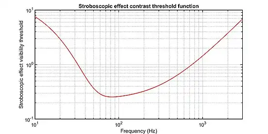 All observer-related influence quantities are stochastic parameters, because not all humans perceive the effect of same light ripple in the same way. That is why perception of stroboscopic effect is always expressed with a certain probability. For light levels encountered in common applications and for moderate speeds of movement of objects (connected to speeds that can be made by humans), an average sensitivity curve has been derived based on perception studies.[6][10] The average sensitivity curve for sinusoidal modulated light waveforms, also called the stroboscopic effect contrast threshold function, as a function of frequency f is as follows: