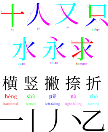 Decomposition of some characters by their basic strokes. Some implementations of this input method assign the keys "h", "s", "p", "n" and z", which are the first letter of the pinyin of the name of the basic stroke they correspond to