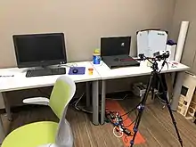 A 3D scanner in a library. Calibration panels can be seen on the right.