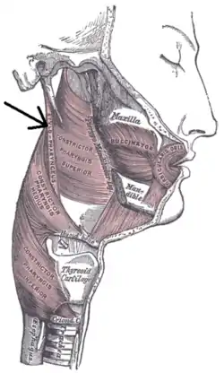 On the lateral pharyngeal wall, it is situated posterior to the superior constrictor muscle, and anterior to the buccopharyngeal fascia.[2]