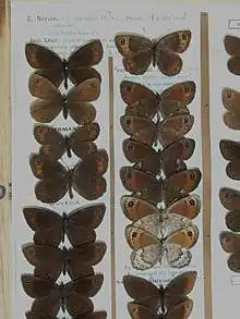 E. nerine Frr. (= goante H Schaff (37 a, b). The upperside dark black-brown with slight gloss. The red-brown transverse band of the forewing is posteriorly interrupted by the veins, forming 3—4 basally somewhat pointed spots; sometimes the band is continuous, which is nearly always the case in the male. There are 2 white-centred black ocelli anteriorly in the band. The band is interrupted by the veins on the hindwing and bears 3 smaller ocelli. The forewing beneath bright russet-red, darker towards the base, the costal and distal margins being black-brown: the ocelli as above. The hindwing beneath dark brown as far as the centre, this area being bordered by a whitish grey narrow band which is somewhat sinuate near its centre; the ocelli in the lighter distal area are mostly indicated by small black-bordered white dots, which are sometimes absent. The ground-colour of the female is lighter, the band of the forewing broader and russet-yellow, the 2 eyes at the apex larger and usually confluent, there being often two additional smaller ocelli towards the hindmargin. The ocelli placed in the band of the hindwing are also larger and have conspicuous white pupils. The forewing beneath is light russet-yellow, darkened towards the base, the costal and distal margins grey-brown, the apex dusted with white-grey The hindwing beneath white grey irrorated with brown atoms; the white-grey band, which limits the dark basal area, contrasts distinctly. The fringes chequered in the female, the distal margin of the hindwing slightly dentate. In the Central and Southern Alps, northward to the Fern Pass and Scharnitz Valley. — reichlini H Schaff (= styx Frr.), from the Bavarian Alps, Reichenhall and the Glockner district, is usually somewhat larger than the first described form. The band of the forewing is strongly reduced. The hindwing with 3 small ocelli in russet red spots. — italica Frey from the Alps of Wallis and North Italy, is a transition from nerine towards reichlini. — In stelviana [now synonym of Erebia pluto Curo, from Bormo, the red band of the forewing is continuous, the underside devoid of ocelli, being paler and basally but indistinctly dusted with white. — morula Esp. from southern slopes of the Eastern Alps, is smaller and darker, the ocelli are but faintly ringed with reddish yellow. Hindwing beneath with the basal half dark brown, the distal area being lighter and bearing 3 white pupils. In South Tirol, Seiser Alp. — nerine flies in various dispersed localities, from the end of June to August in shady places of the forest region up to more than 5000 ft.[2]